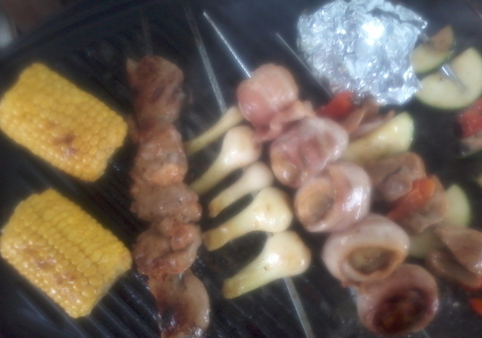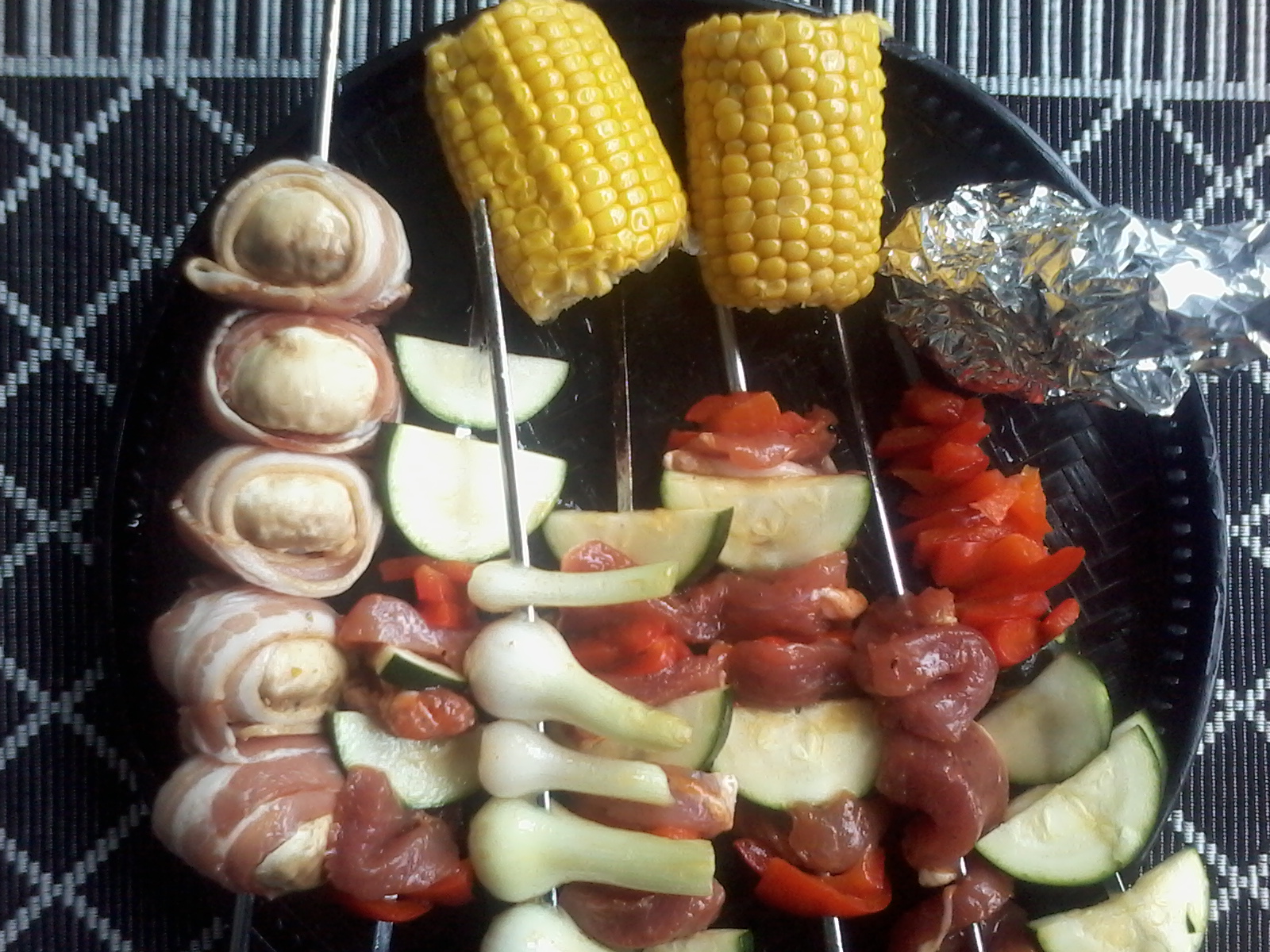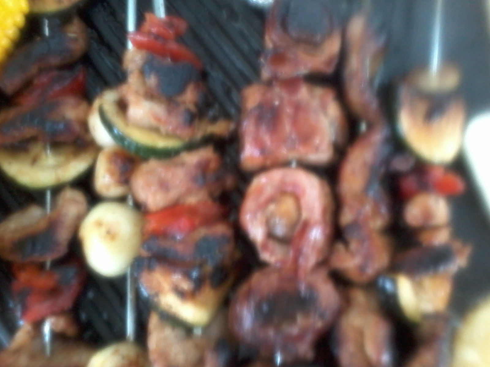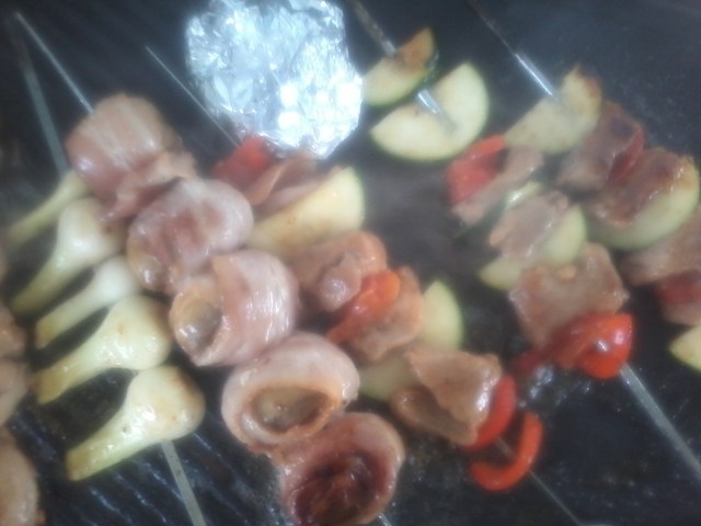 Pekoni-herkkusieni, grillattuna ja vartaina.