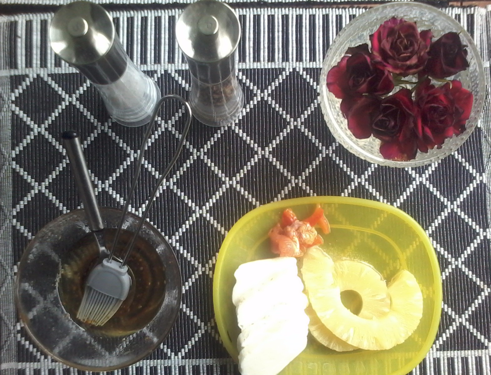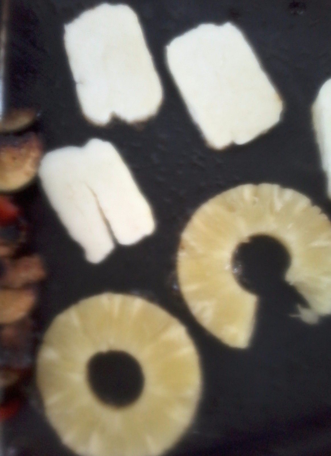 Minulla oli Säilyke Ananasrenkaita ja Grillattava juustoa, GRILLAA Viimeiseksi. Ei tarvitse kuin kääntää kumpakin puoli ja ovat valmiit syötävksi.