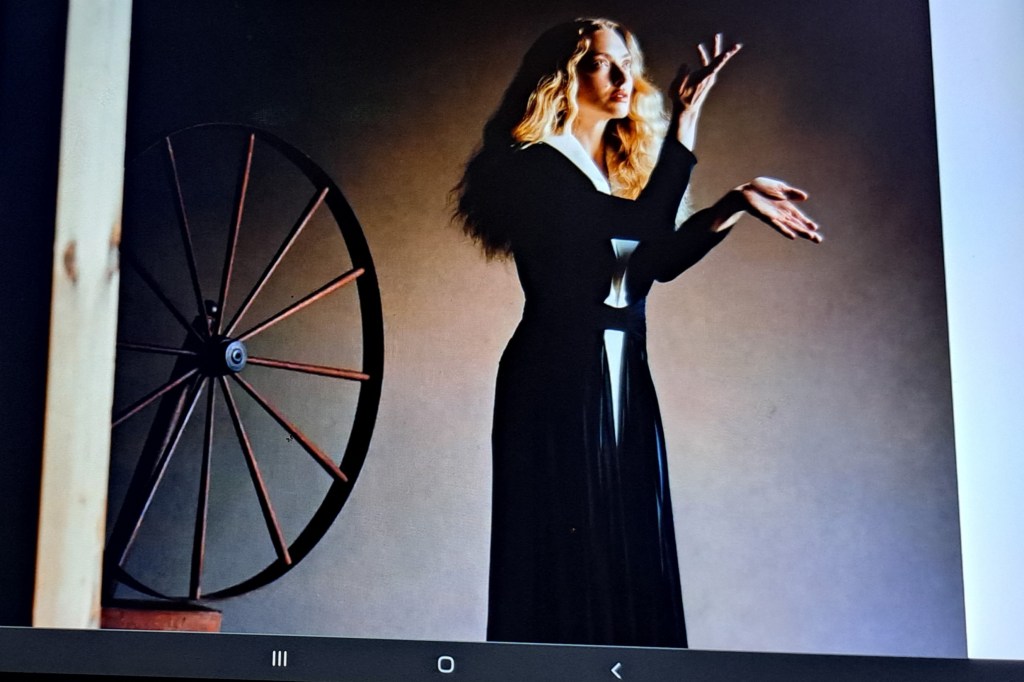 She wear Valentino dress and poses in front of Shaker woolspinning Wheel 1830s.