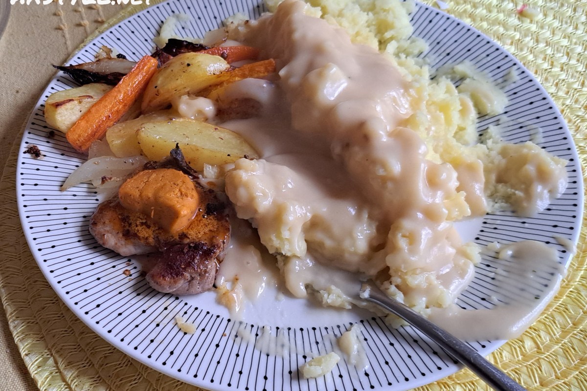 Minulla oli PERUNAMUUSSIA, jäi ed. Ruokailusta. Lisäsin Muussin päälle, Kermakastiketta.