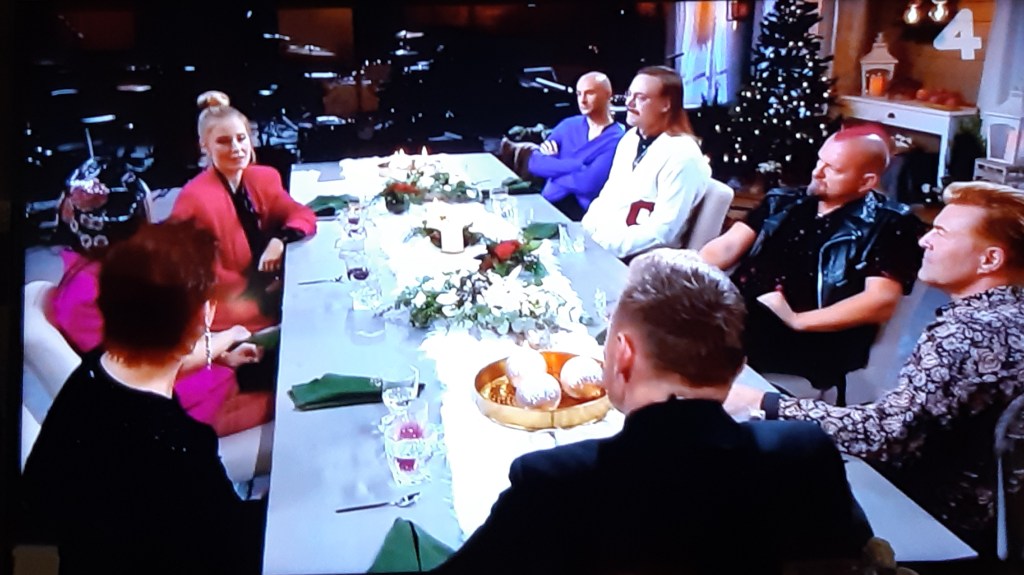 Jokainen ARTISTI oli tuonut jotakin JOULUPÖYTÄÄN….Lisäksi Joululahjat oli arvottu ja OSTETUIN…JAETTIIN jaksossa ESITYSTEN Jälkeen. Mm. Kirjoja, Flaneliyöpuku, Suomen jalkapallo/ PELIPAITA, 10 REDFORD jne.