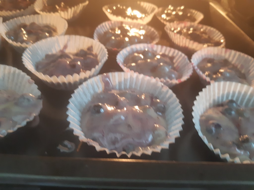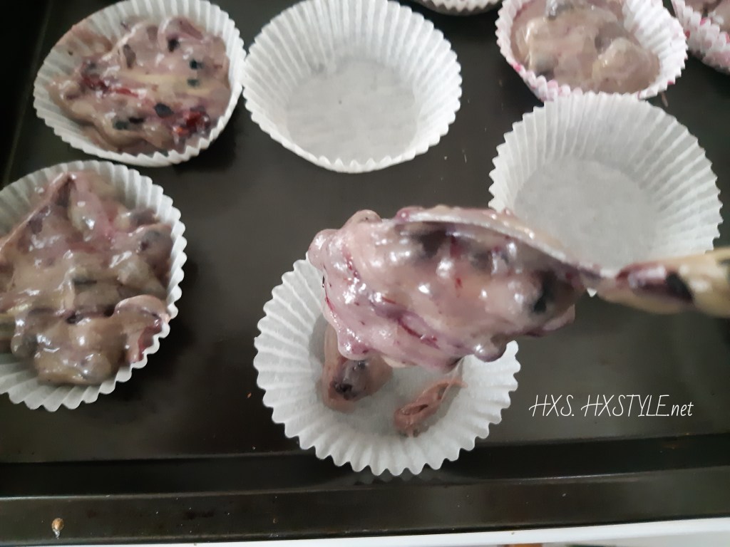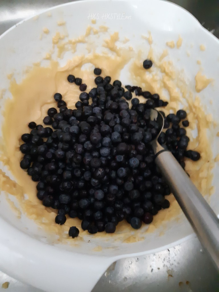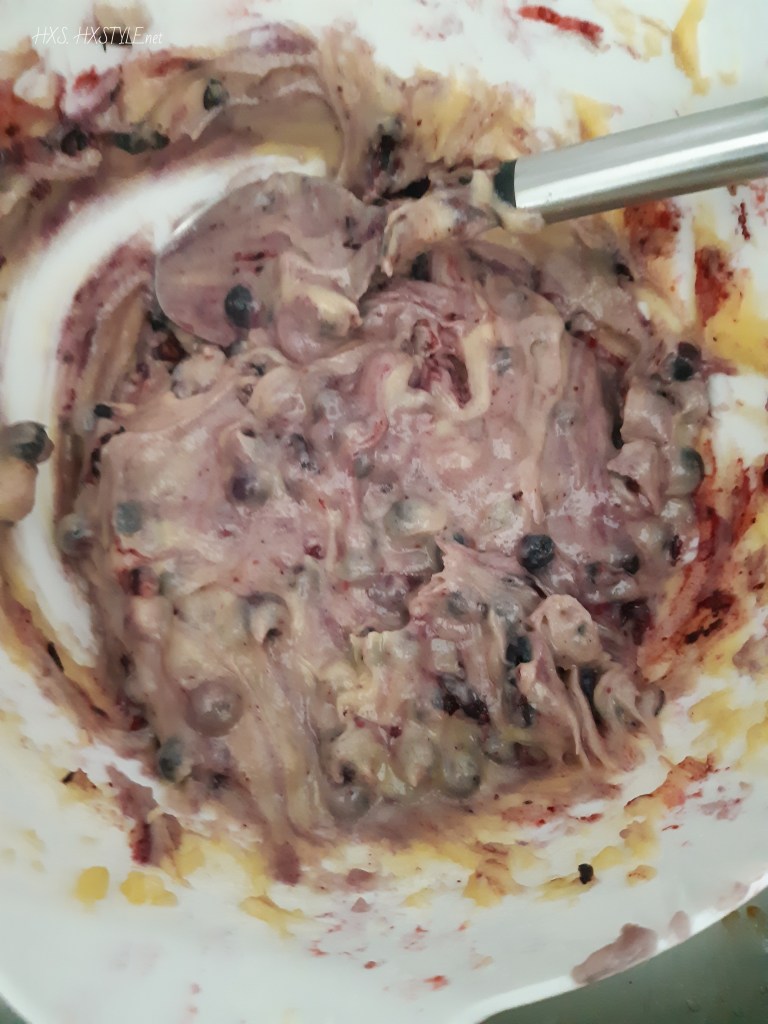 SEKOITA mustikat hyvin taikina seokseen….TASAINEN TAIKINA